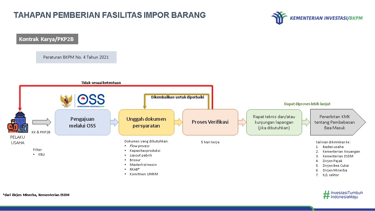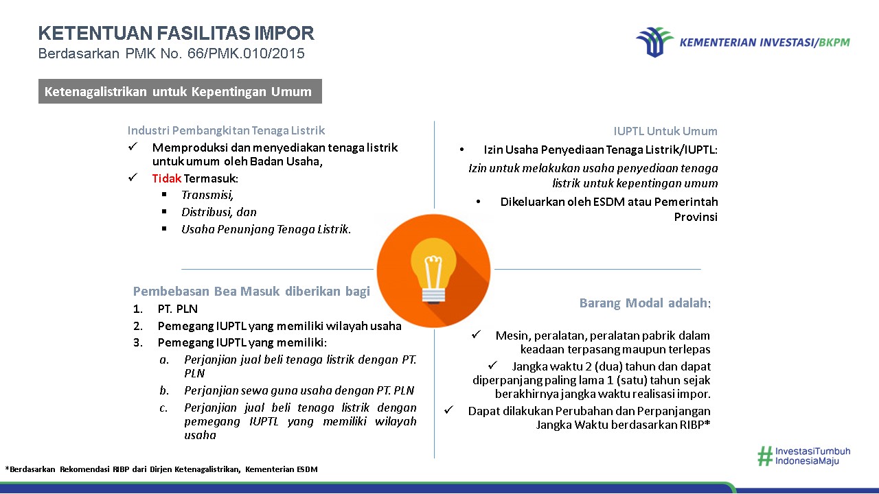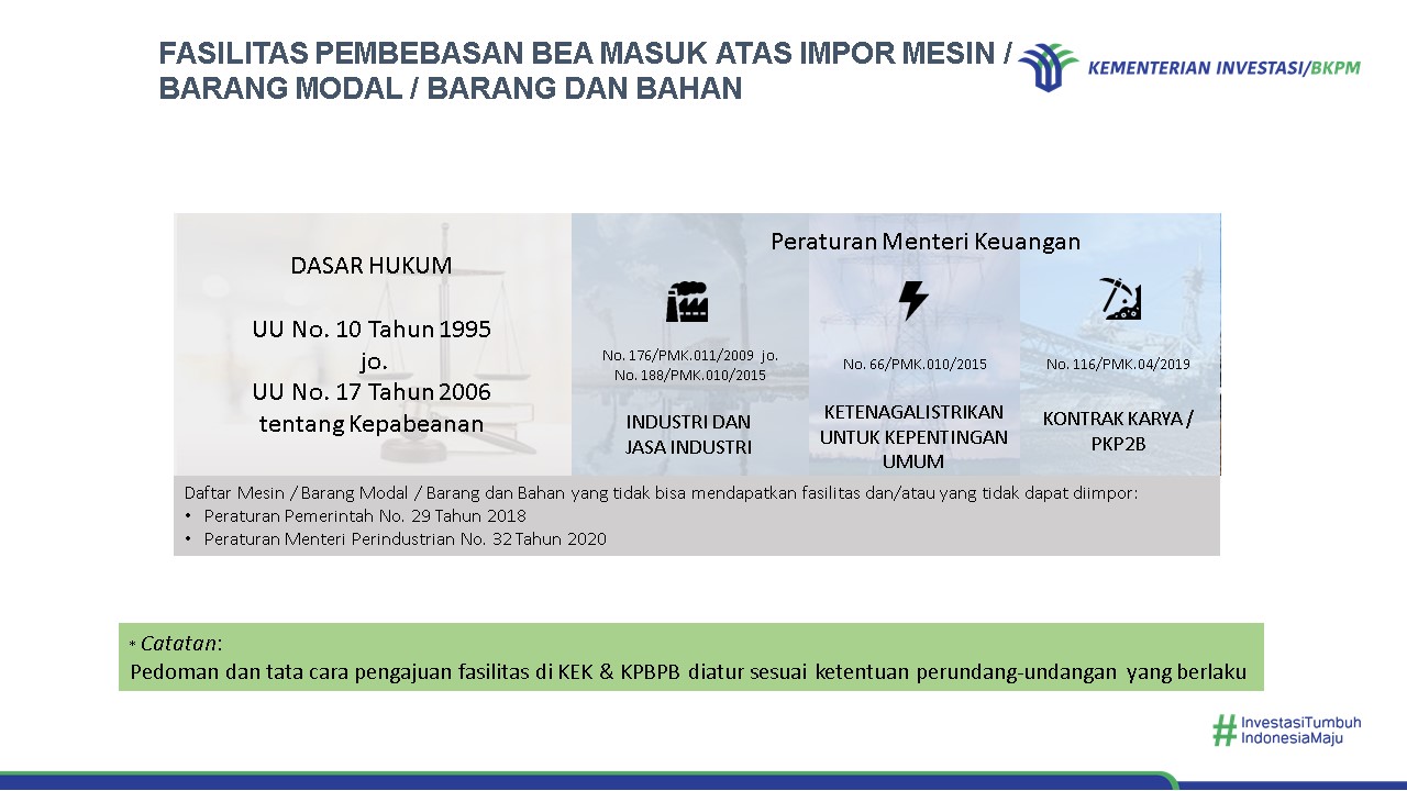 Fasilitas pembebasan bea masuk impor dapat diberikan kepada Pelaku Usaha yang melakukan kegiatan usaha di bidang industri yang menghasilkan barang dan/atau jasa (Peraturan Menteri Keuangan Nomor 176/PMK.011/2009 jo. Nomor 188/PMK.010/2015), industri pembangkitan listrik (Peraturan Menteri Keuangan Nomor 66/PMK.010/2015), serta Kontrak Karya/PKP2B (Peraturan Menteri Keuangan Nomor 116/PMK.04/2019).
